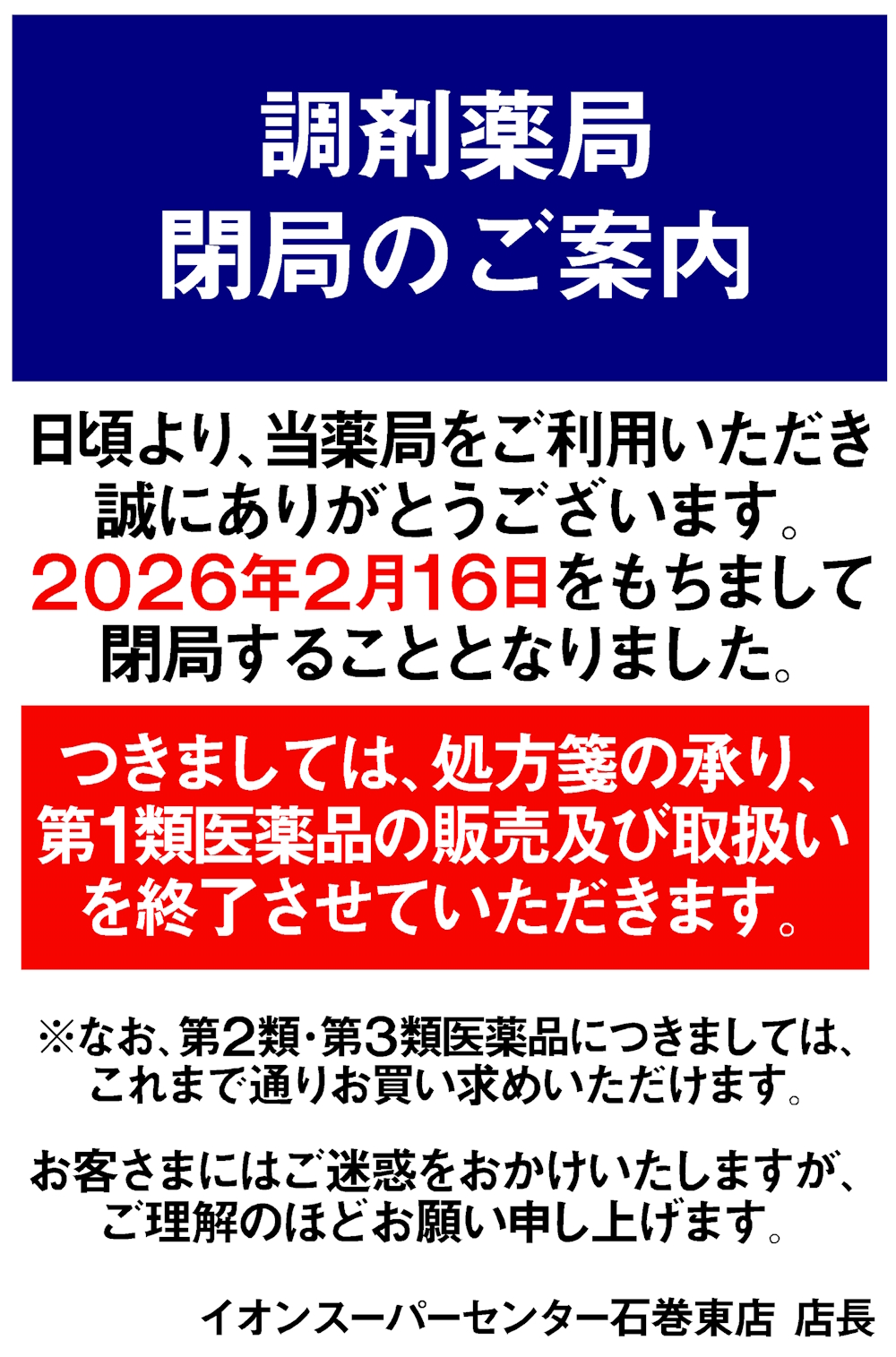 イオンスーパーセンター石巻東店 調剤薬局閉局のご案内