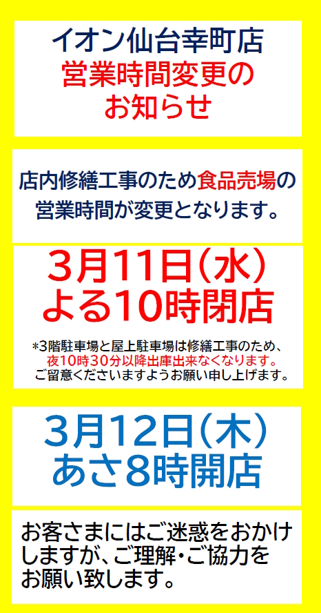 イオン仙台幸町店 営業時間変更のお知らせ
