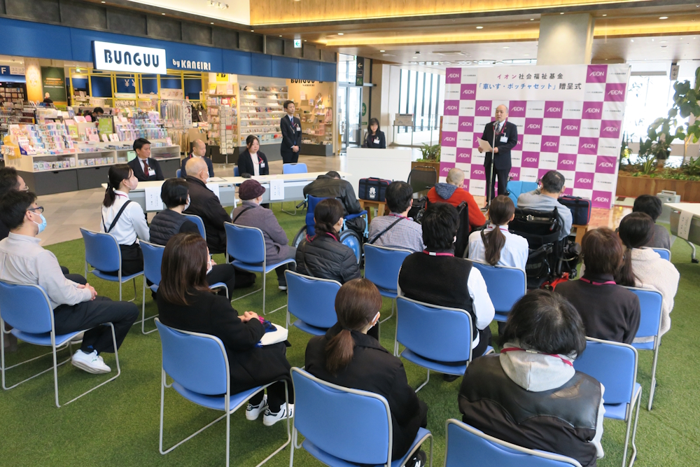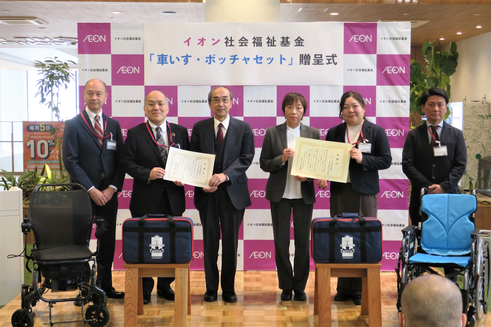 1月28日(水)、イオングループ各社が加盟・運営するイオン社会福祉基金より、宮城県仙台市の「社会福祉法人一寿会 仙萩苑」と「社会福祉法人共生福祉会 萩の郷福寿苑」へ、車いすとボッチャセットを贈呈しました。