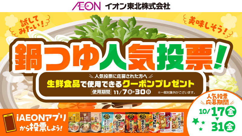 期間中、iAEONアプリにて鍋つゆの人気投票を実施いたします。投票された方に、もれなく野菜・お肉・お魚が5%OFFクーポンになるクーポンを後日プレゼントいたします。