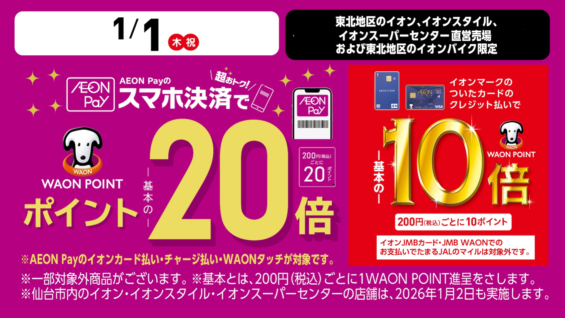 ※本企画の倍付けポイントについて、AEON Payのチャージ払いをご利用の場合はご精算時に進呈、イオンカード払いをご利用の場合は2026年1月25日に進呈します。AEON PayのWAONタッチ・Apple PayのWAON・モバイルWAONをご利用の場合は2倍分はご精算時に進呈、残りの18倍分は2026年1月25日頃に進呈します。(所有者登録をしていないWAONはご精算時に1倍分の進呈となり、合計19倍の進呈となります。他の特典や倍付企画と重複した場合は、差分を進呈いたします。イオンマークのついたクレジット支払いをご利用の場合は、2倍分はご精算時に進呈、残りの8倍分は2025年1月25日頃に進呈します。