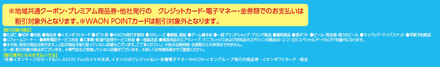 - ・各種イオンマークの付いたカード、AEON Payのスマホ決済、イオンiDでのクレジット払い