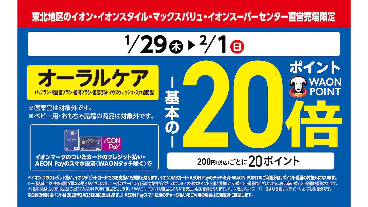 本企画の倍付ポイントは、2026年2月25日頃に進呈いたします。※AEON Pay スマホ決済のチャージ払いをご利用の場合は、ご精算時に即時進呈となります。