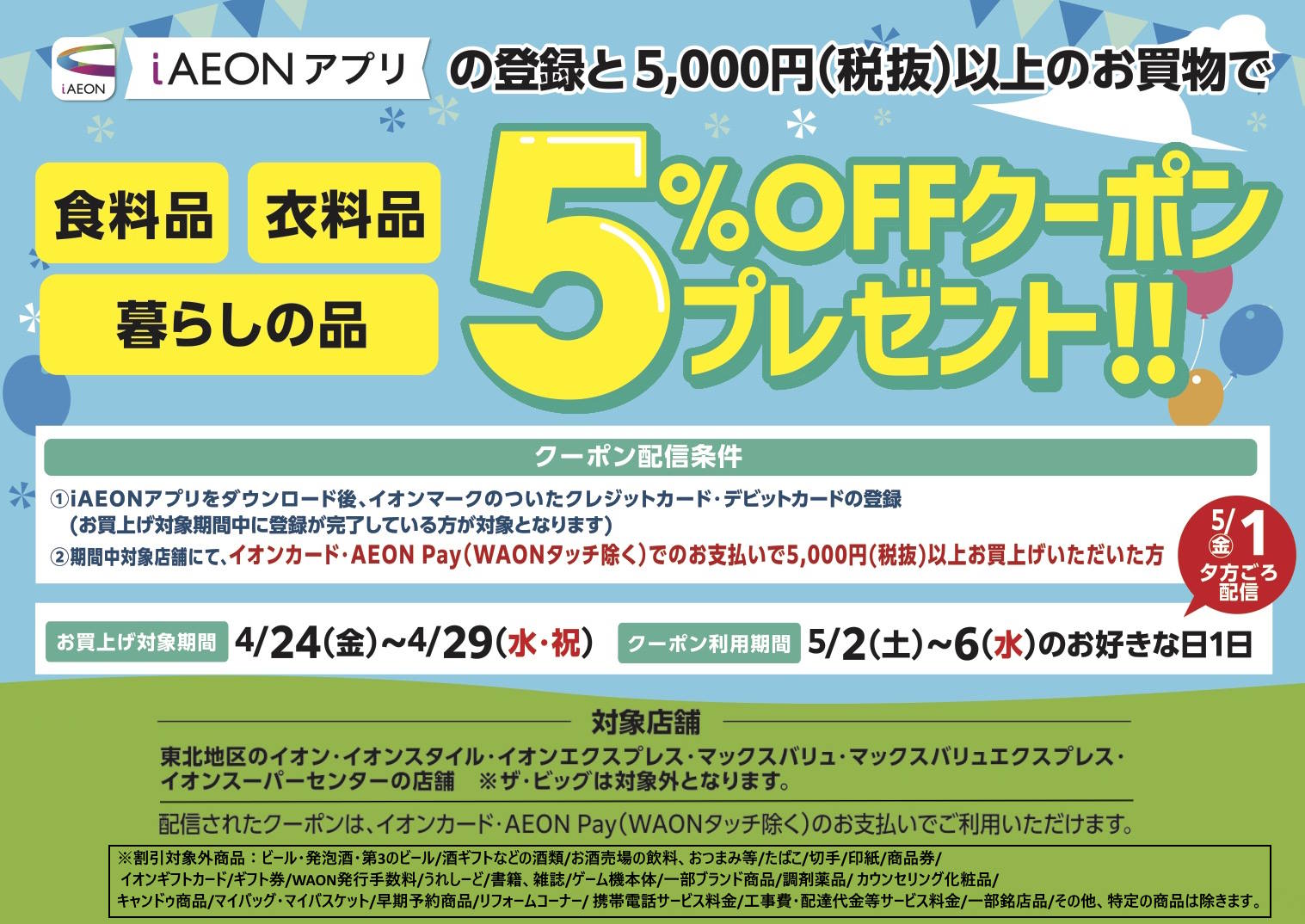 iAEONアプリのダウンロード、会員登録※と期間中、イオンカード・AEON Pay(カード払い・チャージ払い)お支払いにて5,000円(税抜)以上お買上げいただいたお客さまへ
