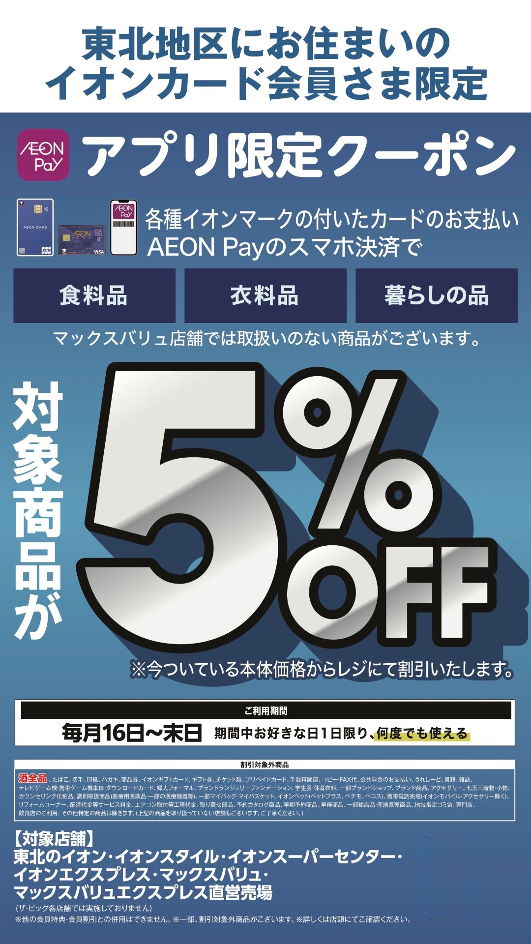 ※イオン東北ネットスーパー、イオン東北オンラインなどオンラインショップは利用対象外となります。