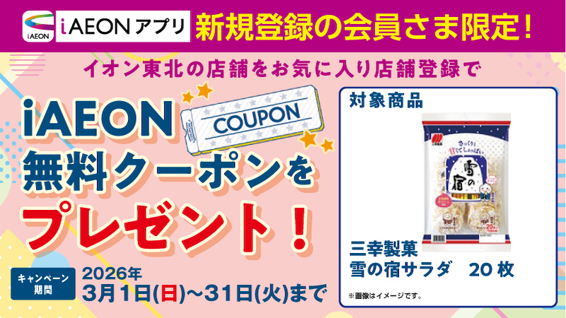 iAEONアプリを新規ダウンロード・会員登録いただき、イオン東北の店舗をお気に入りに設定いただくと指定商品1点無料のクーポンを配信いたします。※既に会員登録・お気に入り店舗設定済みの方は対象外となります。