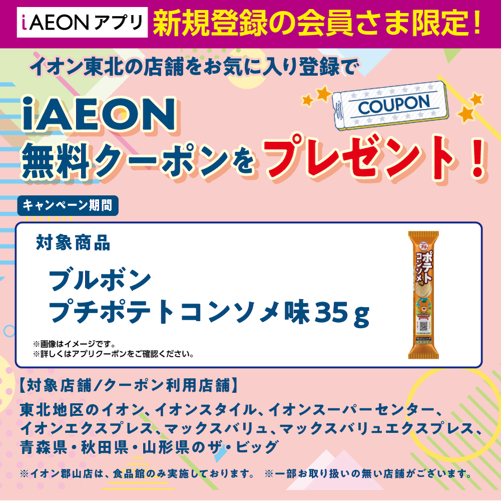 iAEONアプリを新規ダウンロード・会員登録いただき、イオン東北の店舗をお気に入りに設定いただくと指定商品1点無料のクーポンを配信いたします。※既に会員登録・お気に入り店舗設定済みの方は対象外となります。