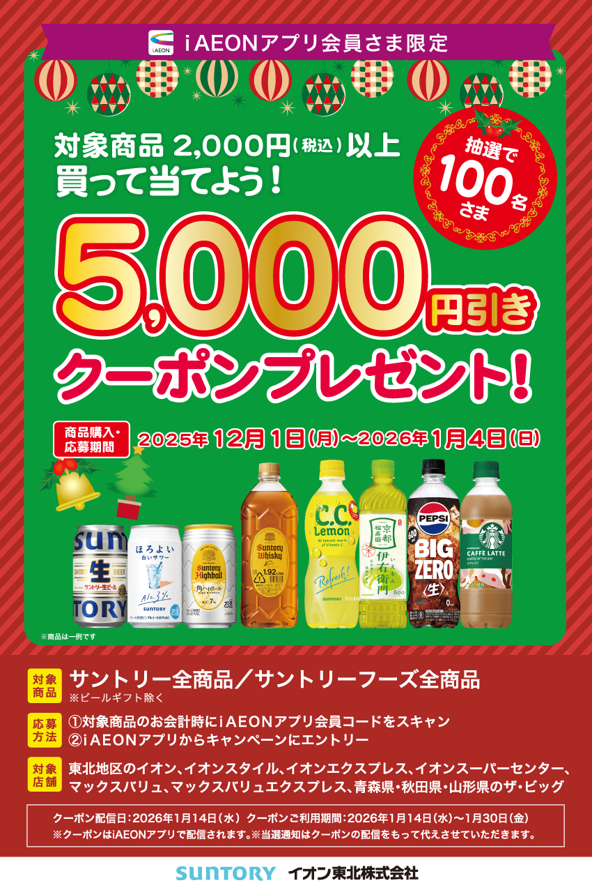 期間中、iAEONアプリ会員コードをご提示の上、対象商品を含む2,000円以上お買い上げいただき、iAEONアプリからキャンペーンにエントリーいただいた方から抽選で100名さまに5,000円引きクーポンを1枚プレゼントいたします。※後日、iAEONアプリ上でクーポンを配信いたします。