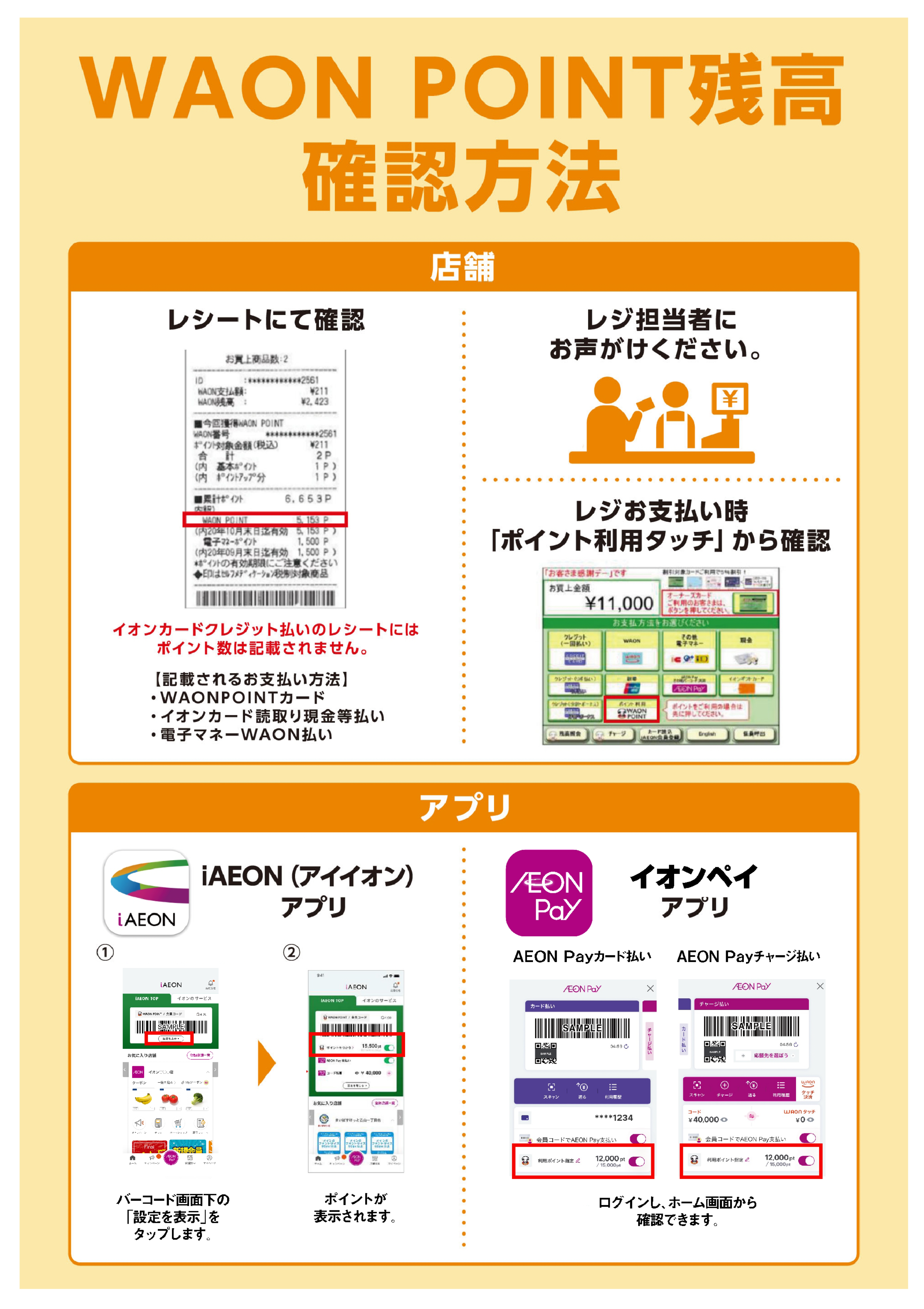 iAEONアプリ、AEON Payアプリ、smart WAON ウェブサイトまたはレシートでもご確認いただけます。