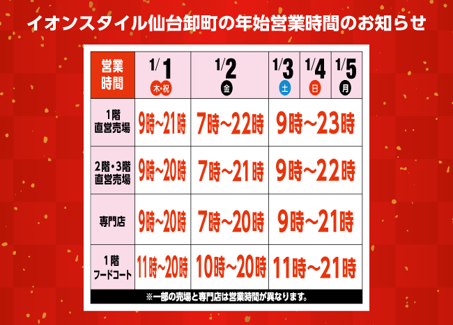 | イオンスタイル仙台卸町内郵便局 | 郵便局 | 10:00〜18:00 | 1F | 022-235-6501 |