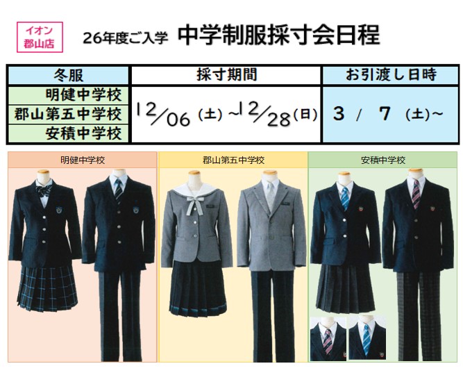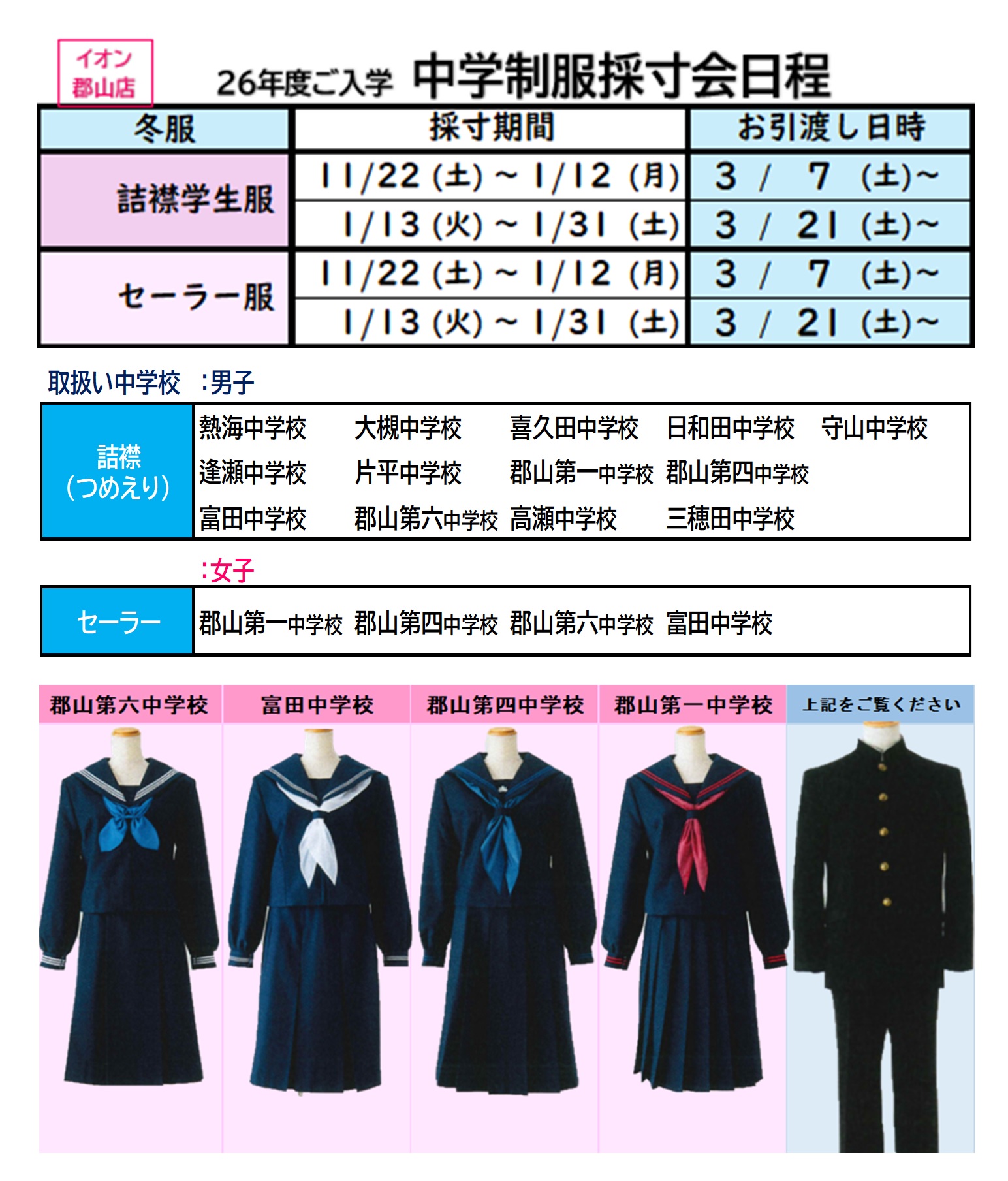イオン郡山店では、中学校制服採寸・受注承りをいたします。