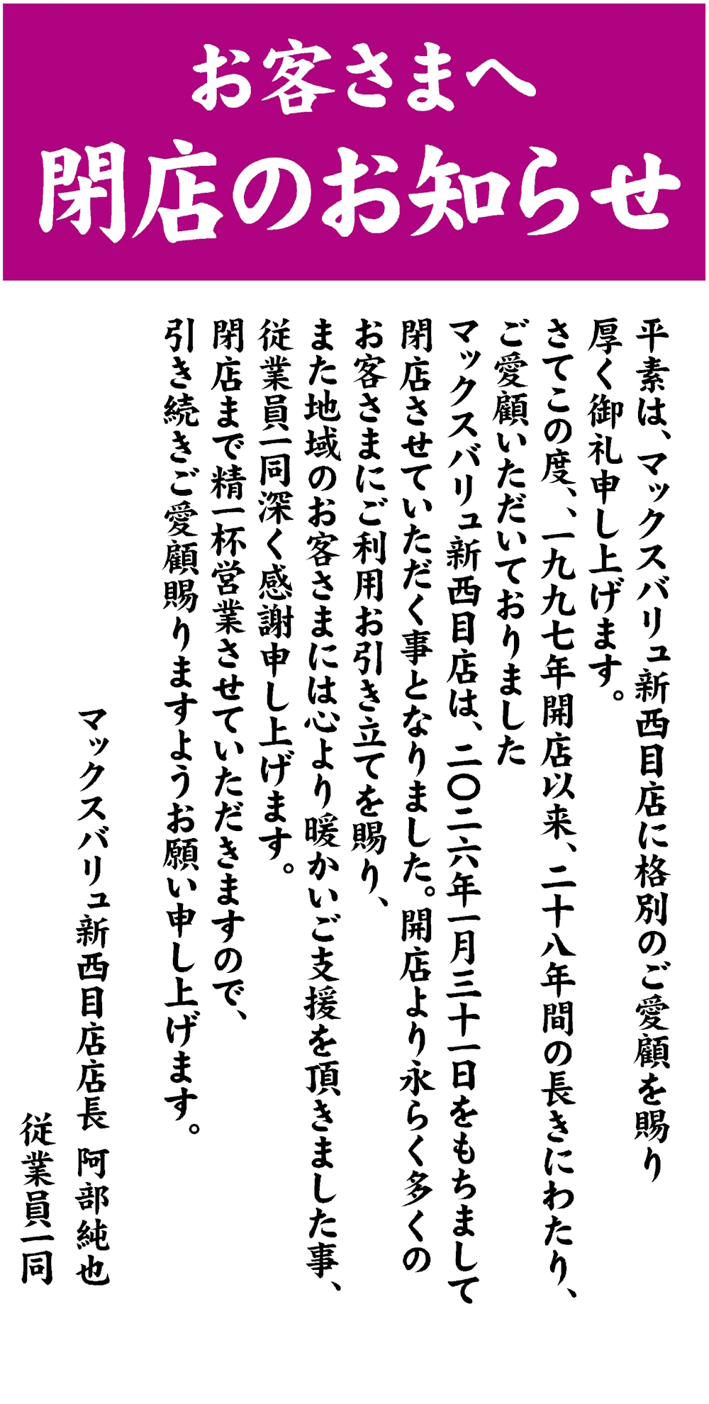 マックスバリュ新西目店 閉店のお知らせ