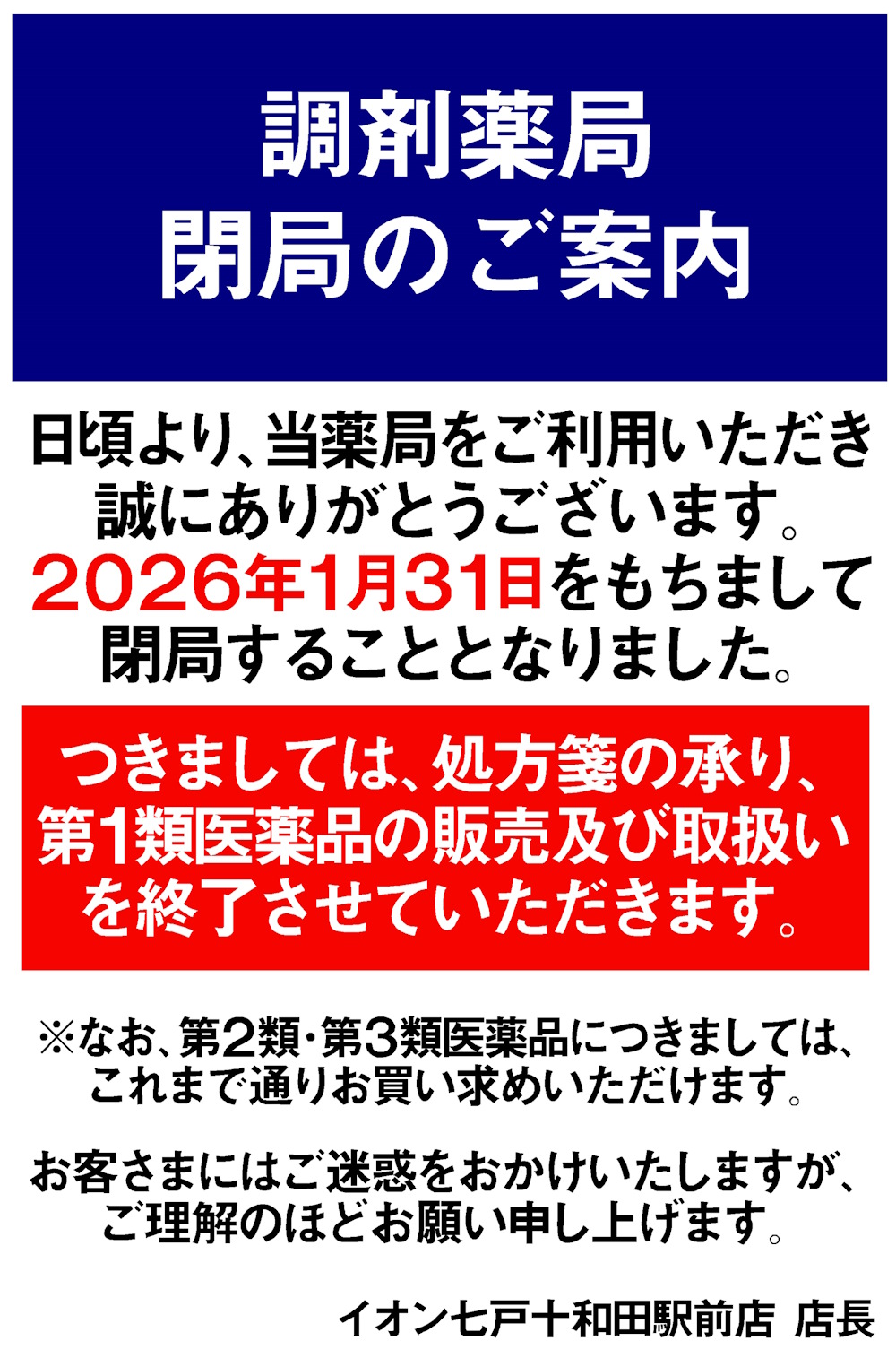 イオン七戸十和田駅前店 調剤薬局閉局のご案内