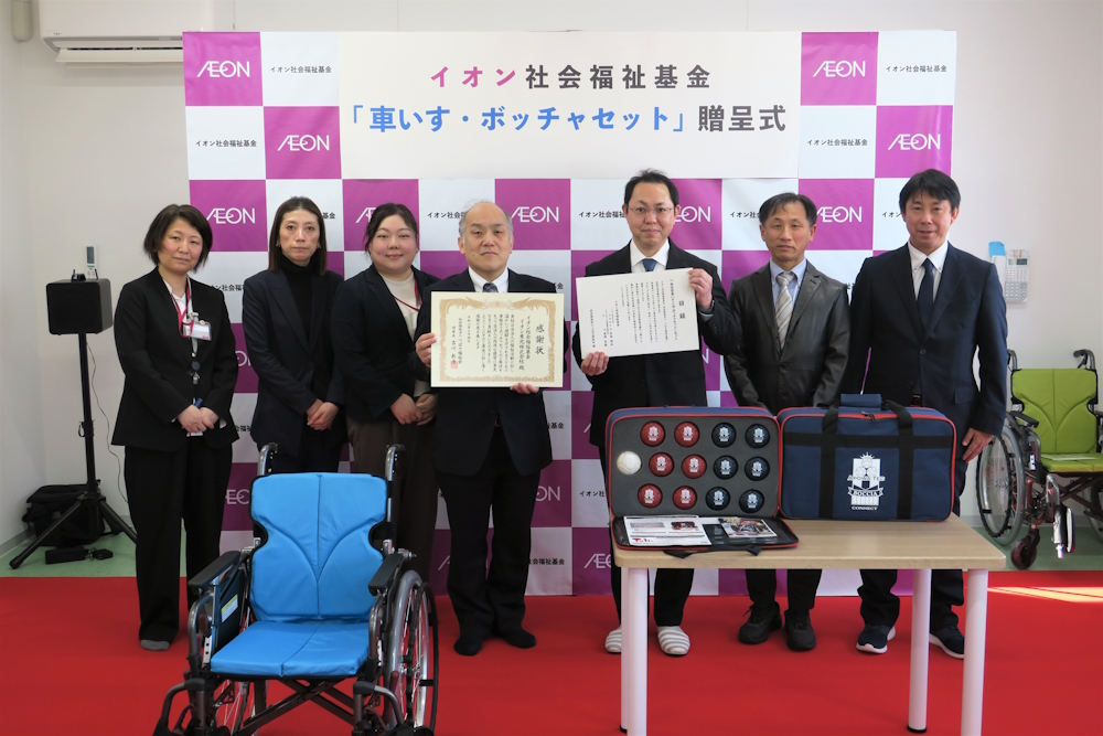 2月4日(水)、イオングループ各社が加盟・運営するイオン社会福祉基金より、福島県福島市の「社会福祉法人 つばさ福祉会」へ、車いすとボッチャセットを贈呈しました。