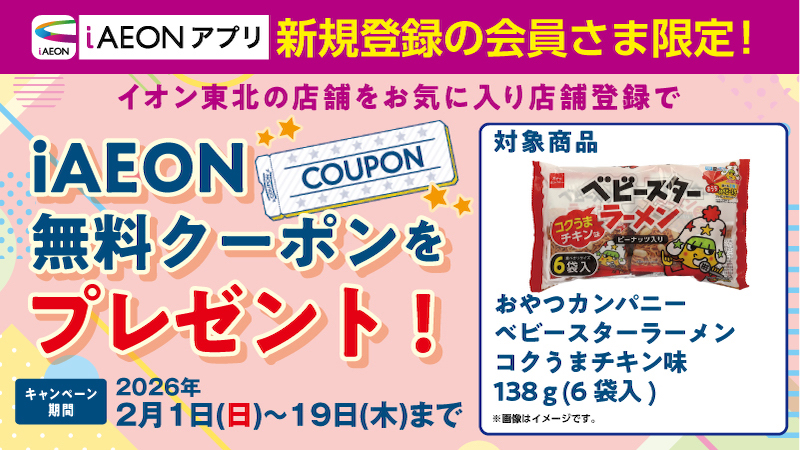 iAEONアプリを新規ダウンロード・会員登録いただき、イオン東北の店舗をお気に入りに設定いただくと指定商品1点無料のクーポンを配信いたします。※既に会員登録・お気に入り店舗設定済みの方は対象外となります。