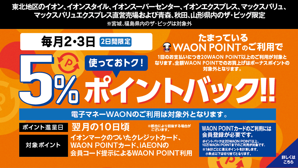※イオン東北ネットスーパー、イオン東北オンラインなどオンラインショップは利用対象外となります。