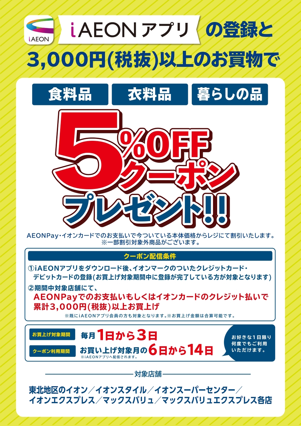 東北地区のイオン/イオンスタイル/イオンスーパーセンター/イオンエクスプレス/マックスバリュ/マックスバリュエクスプレス※ザ・ビッグ、イオンモール・専門店は対象外となります。