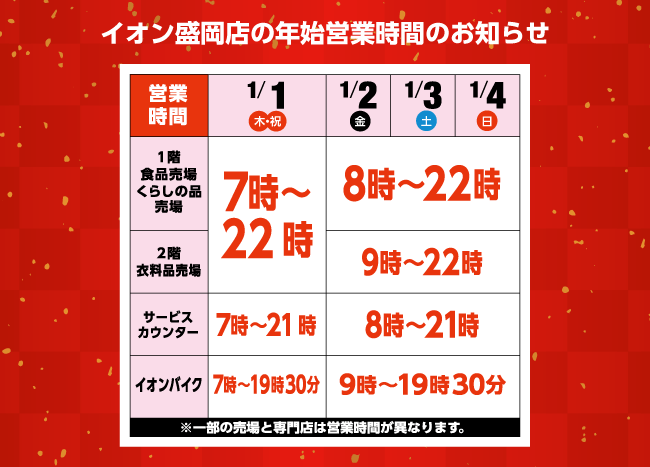 | 岩手銀行 (中央入口) | 10:00〜21:00 | 10:00〜21:00 | 10:00〜21:00 |