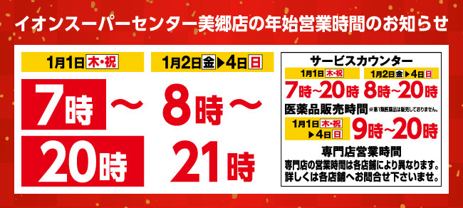 | イオン銀行 ATM | 8:00~21:00 | 8:00~21:00 | 8:00~21:00 |